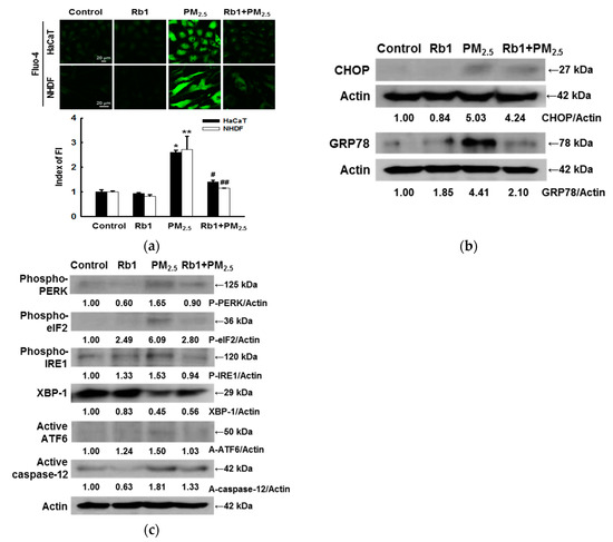 Ginsenoside Rb1 confers protection from PM2.5-induced ER stress. Cells were pre-treated with ginsenoside Rb1 for 1 h, followed by treatment with PM2.5 (50 μg/mL) for 24 h. (a) Intracellular Ca2+ levels were examined by confocal microscopy using Fluo-4-AM (FI: Fluorescence intensity). *,** p < 0.05 compared to the control groups of both HaCaT and NHDF cells, respectively; #,## p < 0.05 compared to PM2.5-treated groups of both HaCaT and NHDF cells, respectively. In HaCaT cells, the expression of the proteins (b) CHOP, GRP78, (c) phospho-PERK, phospho-eIF2, phospho-IRE1, XBP-1, active ATF6 and active caspase-12 were analyzed by western blotting.