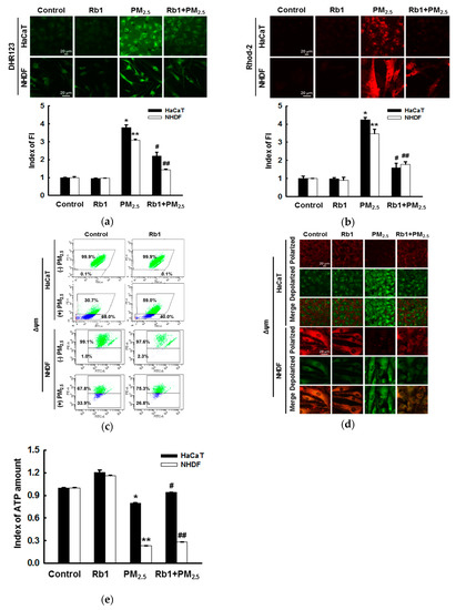 Ginsenoside Rb1 confers protection against PM2.5-induced mitochondrial damage. Cells were pre-treated with ginsenoside Rb1 for 1 h, followed by treatment with PM2.5 (50 μg/mL) for 24 h; they were then analyzed by confocal microscopy to assess (a) mitochondrial ROS (DHR 123 staining) and (b) mitochondrial Ca2+ levels (Rhod-2 AM staining). FI: Fluorescence intensity. The Δψm was determined using JC-1 dye by (c) flow cytometry and (d) confocal microscopy. (e) The amount of ATP in the cells was measured using an ATP determination kit. (a,b,e). *,** p < 0.05 compared to the control groups of both HaCaT and NHDF cells, respectively; #,## p < 0.05 compared to PM2.5-treated groups of both HaCaT and NHDF cells, respectively.