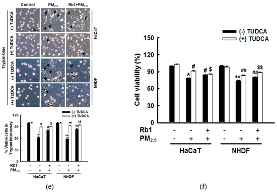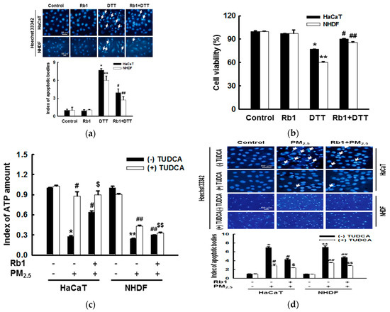 To confirm these findings, we used ER stress inducers to examine the effects of ginsenoside Rb1 on ER stress in HaCaT and NHDF cells. Fluorescence microscopic cell images of Hoechst 33342-stained nuclei showed that ginsenoside Rb1 significantly reduced the proportion of apoptotic bodies induced by the ER stress inducer DTT (Figure 7a). The MTT assay also confirmed the significant protective effect of ginsenoside Rb1 against DTT-induced cell death (Figure 7b). To determine the correlation between mitochondria and ER during the process of cell damage induced by PM2.5, ATP levels, apoptosis, and cell viability were measured after treatment with the ER stress inhibitor tauroursodeoxycholic acid (TUDCA). The decrease in ATP levels induced by PM2.5 was partially recovered by treatment with TUDCA or ginsenoside Rb1, and the ATP recovery rate in the PM2.5 group co-pre-treated with TUDCA and ginsenoside Rb1 was significantly higher than that in the PM2.5 group pre-treated with ginsenoside Rb1. However, there was no significant difference between the ATP recovery rate of the PM2.5 group co-pre-treated with TUDCA and ginsenoside Rb1 and the PM2.5 group pre-treated with only TUDCA (Figure 7c). After treatment with TUDCA, the results of apoptosis detected using Hoechst 33342 staining (Figure 7d) and the results of cell viability detected with trypan blue reagent (Figure 7e) and MTT assay (Figure 7f) also showed similar protection patterns. These results indicate that cell damage caused by PM2.5 is not only directly caused by induced ER stress, but also by ER stress-associated mitochondrial dysfunction, which is inhibited by ginsenoside Rb1.