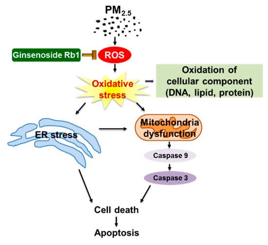 A schematic diagram of the protective effect of ginsenoside Rb1 against PM2.5. Ginsenoside Rb1 inhibits PM2.5-induced oxidative stress and prevents ER stress generation and mitochondrial dysfunction, thereby protecting cells from PM2.5 injury.
