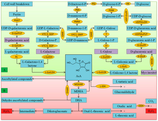 Ascorbate biosynthesis and metabolism is a complex set of reactions, some involving unidentified enzymes; some of the products are reactive and potentially damaging carbonyl compounds, (A) biosynthetic pathway; and, (B) regeneration and degradation pathways in plants. The metabolites in the violate box represent the name of each biosynthetic pathway. The elaborated name of enzymes are as follows (HK: Hexokinase; PGI: glucose-6-phosphate isomerase; PMI: mannose-6-phosphate isomeras; PMM: phosphomannomutase; TC1 or GMP: GDP-d-mannose pyrophosphorylase/mannose-1-phosphate guanylyltransferase; VTC2 or GGP: GDP-d-mannose 3′,5′-epimerase, GME: GDP-l-galactose phosphorylase;VTC4 or GPP:l-galactose-1-phosphate phosphatase; GalDH: l-galactose dehydrogenase; l-GalLDH: l-galactono-1,4-lactone dehydrogenase; ?: nucleotide pyrophosphatase or sugar-1-phosphate guanyltransferase; ??: sugar phosphatase; l-GulDH: l-gulose dehydrogenase; l-GulL: l-gulonolactonase; l-GulLOX: l-gulono-1,4-lactone oxidase; PPGT: polygalacturonate 4-alpha-galacturonosyltransferase; d-GalPUT: d-galacturonate-1-phosphate uridyltransferase; d-GalUR: d-galacturonate reductase; AL: aldonolactonase; PGM: phosphoglucomutase; UDPGluPP: UDP-glucose-pyrophosphorylase; UDP-GluDH: UDP-glucose dehydrogenase; UDP-GluPUT: glucuronate-1-phosphate uridylyltransferase; d-GluPP: d-glucurono-1-phosphate phosphatase; MIOX: myo-inositol oxygenase;d-GluR: d-glucuronate reductase; MDHAR: monodehydroascorbate reductase; DHAR: dehydroascorbate reductase;l-IDH: l-Idodonate dehydrogenase).