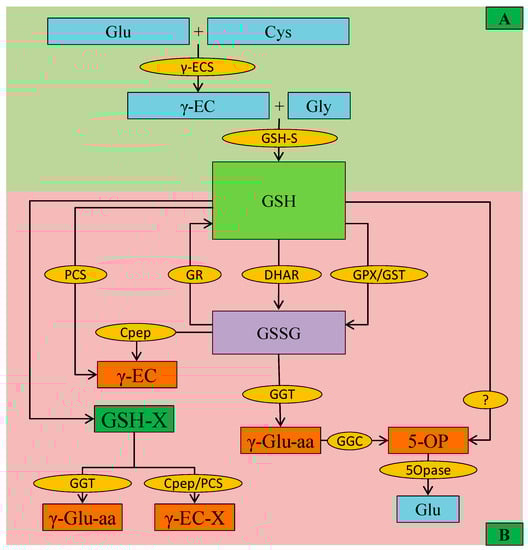 The degradation of GSH is another important phenomenon of GSH metabolism (Figure 3). Up to now, as many as four types of GSH degrading enzymes have been described, which either use GSH or act on GSSG or other GSH-conjugates. Among them, carboxypeptidase activity could degrade GSH itself or GSH-conjugates. Cytosolic PCS is another enzyme that is responsible for the breakdown of GSH-conjugates that are mainly activated during metal/metalloid(s) stress. Another enzyme γ-glutamyl transpeptidase (GGT) acts in GSH transpeptidation or hydrolysis, which is further converted to free Glu by the action of GGC (γ-glutamyl cyclotransferases) and 5-oxoprolinase (5-OPase) (Figure 3) [31,36]. Moreover, another vacuolar GGTs have been reported in Arabidopsis, which breaks GSH-conjugates [37]; hence, along with PCS, GGTs is important for metabolizing GSH-conjugates that is formed during secondary metabolites synthesis [37,38].