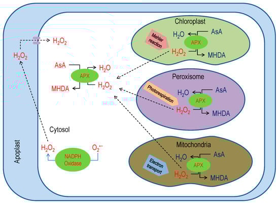In plant cell, APX scavenges H2O2, which mainly participates in AsA-GSH cycle catalyzes the reactions produces MDHA (Figure 4) and, subsequently, MDHA yields DHA [6,10,44].
