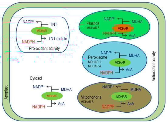 Interestingly, MDHAR can bind substrates other than MDHA, such as isoascorbic acid Evidence showed that phenoxyl radicals, like ferulic acid, quercetin, chlorogenic acid, and coniferyl alcohol, might be reduced by MDHAR [48]. In Arabidopsis, MDHAR activity reduces 2,4,6-trinitrotoluene (TNT) and creates its toxicity (Figure 5), but the MDHAR6 mutants are more tolerant, as TNT could not reduce and thus autooxidizes to creates O2− [49].