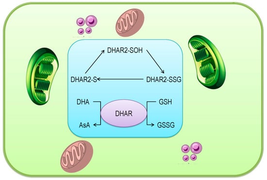 As stated earlier, the integral function of DHAR is to reduce DHA to regenerate AsA. During this process, the active site of Cys is oxidized by DHA and further converted to the sulfenic acid. The reaction requires one molecule of H2O. Knockout mutants of Arabidopsis DHAR1, DHAR2, and DHAR3, did not show any significant differences in total AsA content until facing the abiotic stress condition, which confirmed the necessity of DHAR in reducing the DHA during stress [55].