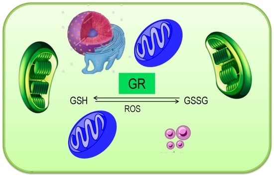 Glutathione is very important for various physiological processes, especially during abiotic stress; it coordinates with AsA turnover and is oxidized to GSSG [35]. Moreover, some other thiol-dependent enzymes, GPX and GST use GSH as co-factor, hence converted to GSSG, which is further reduced back to GSH, with GR catalysis. In higher plants, there are two genes that are reported to encode GRs (GR1 and GR2), where GR2 is essential for plant development [31,34].
