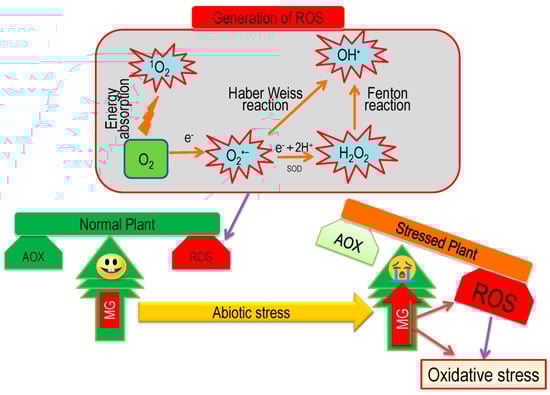 Each plant cell maintains a dynamic balance between ROS and ROS-scavenging antioxidants. Abiotic stress destroys such cellular balance in favor of oxidative reactions by producing a huge amount of ROS [85]. Insufficient energy indulgence in the photosynthetic process during abiotic stresses reduces molecular oxygen and then produces a large amount of ROS, including H2O2, O2−, 1O2, OH•, and so on (Figure 8) [10,86]. Reactive oxygen species are extremely reactive molecules and they can damage a large variety of cellular biomolecules, including carbohydrates, nucleic acids, lipids, proteins, etc., and alter their functions [85,87]. In addition, MG, a cytotoxic compound and reactive oxidizer, spontaneously produced in a cell in little amount but under abiotic stresses, its production increased and participated in developing oxidative stress (Figure 8). Similar to ROS, MG production is increased under abiotic stress, which can damage the ultra-structural constituents of cell and cause mutation, and ultimately provokes programmed cell death (PCD) [10].