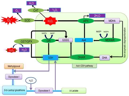 Plant cells have well established antioxidant defense and glyoxalase system for scavenging toxic ROS and MG, respectively. The antioxidant defense system consists of some non-enzymatic components (AsA, GSH, alkaloids, α-tocopherol, non-protein amino acids, and phenolic compounds) and enzymatic components (SOD, CAT, APX, MDHAR, DHAR, GR, GST, and GPX [5,28]). Within the antioxidant defense system, the AsA-GSH pool performs the direct and significant role for minimizing stress effect through scavenging of ROS by using key four enzymes, e.g. APX, MDHAR, DHAR, and GR [28,88,89]. In our previous section (Section 3.3, 3.4, 3.5, and 3.6), we elaborately discussed the function of these four enzymes in ROS detoxification. Usually, in the antioxidant defense system, SOD gives frontline protection against ROS by converting O2− to H2O2. Subsequently, CAT and APX scavenge H2O2 to H2O. Glutathione peroxidase and GST also scavenge H2O2 to H2O with the help of GSH (Figure 9) [28].