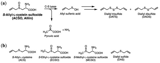 46. Kodera, Y.; Suzuki, A.; Imada, O.; Kasuga, S.; Sumioka, I.; Kanezawa, A.; Taru, N.; Fujikawa, M.; Nagae, S.; Masamoto, K.; et al. Physical, chemical, and biological properties of S-allylcysteine, an amino acid derived from garlic. J. Agric. Food Chem. 2002, 50, 622–632. [Google Scholar] [CrossRef]