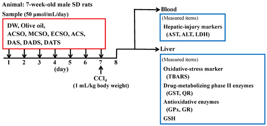 Rats were divided into 11 groups of six rats (Figure 2). ACSO, MCSO, ECSO, ACS, DAS, DADS, and DATS at a dosage of 50 μmol/mL/day were orally administered via gavage to rats of the corresponding group for seven consecutive days. ACSO, MCSO, ECSO, and ACS were dissolved in distilled water (DW), while DAS, DADS, and DATS were dissolved in olive oil at the time of use. Control rats received only either DW or olive oil. CCl4 was intraperitoneally administered at a dosage of 1 mL/kg body weight after oral administration of the sulfoxides and sulfides on the seventh day. Then, the rats were subjected to fasting for 24 h and thereafter sacrificed. The liver was excised, and the microsomal and cytosolic fractions were prepared by centrifugation as described [40]. Briefly, serum was separated from sodium citrate-treated whole blood by centrifugation at 1500× g for 15 min at 4 °C.