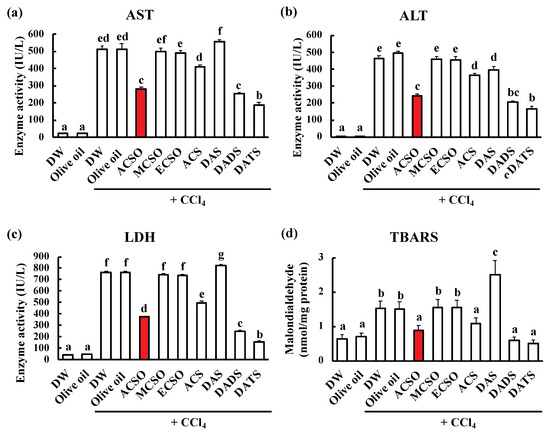 Figure 3. Effect of ACSO, its analogs, and garlic-odor compounds on markers for hepatic injury and oxidative stress. Aspartate transaminase (AST) activity (a), alanine transaminase (ALT) activity (b), lactate dehydrogenase (LDH) activity (c), and the amount of thiobarbituric acid reactive substances (TBARS) (d) in the blood of rats with CCl4-induced hepatic injury. Each value represents the mean of six rats ± S.E. The different letters in the figures indicate a significant difference between the groups (p < 0.01).