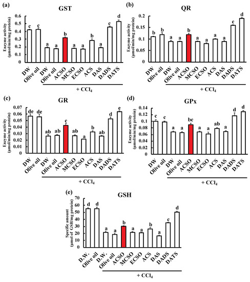 Figure 4. Effect of ACSO, its analogs, and garlic-odor compounds on Phase II and antioxidative enzyme activities and glutathione (GSH) content. Enzymatic activities of (a) glutathione-S-transferase (GST), (b) quinone reductase (QR), (c) glutathione reductase (GR), (d) glutathione peroxidase (GPx), and (e) GSH, in the livers of rats with CCl4-induced hepatic injury. Each value represents the mean of six rats ± S.E. The different letters in the figures indicate a significant difference between the groups (p < 0.01).