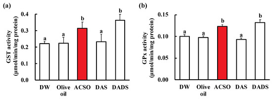 Rats were divided into four groups of six rats. ACSO, DADS, and DAS at a dosage of 50 μmol/mL/day were orally administered to normal healthy rats of the corresponding group for seven consecutive days. ACSO was dissolved in DW, while DADS and DAS were dissolved in olive oil for use. Control rats received only DW or olive oil. The rats were subjected to fasting for 24 h following oral administration of ACSO, DADS, and DAS on the seventh day and then sacrificed. The activities of GST and GPx were measured as described in 2.2.2.