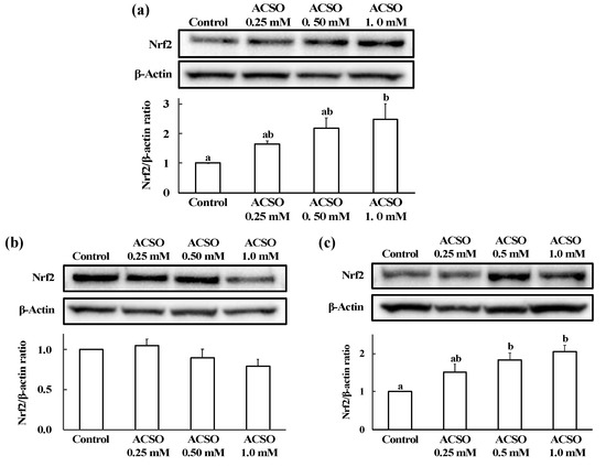 Figure 6. Effect of ACSO on Nrf2 nuclear translocation in HepG2 cells. The expression levels of Nrf2 were analyzed by Western blot analysis in whole cell (a), cytoplasm (b), and nuclei (c) preparations of HepG2 cells. Expression was quantified as the ratio of Nrf2 expression to β-actin expression. Each value represents the mean of three experiments ± S.E. The different letters indicate a significant difference between the groups (p < 0.05).
