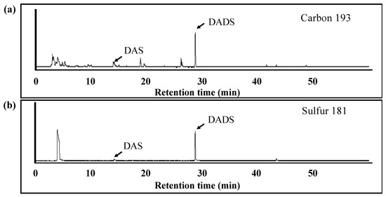 Figure 8. Element chromatograms of volatile compounds obtained from the mixture of ACSO and proteins of the small intestine to assess ACSO metabolism. Carbon was detected at 193 nm (a) and sulfur was detected at 181 nm (b).