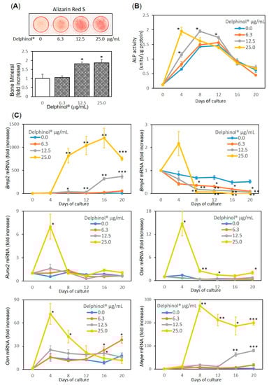 Stimulatory effects of Delphinol® on osteoblastogenesis. (A) Mineralization of MC3T3-E1 cells. Confluent culture was incubated with Delphinol® at indicated concentrations for 16 days. At the end of incubation, cells were washed then fixed with 70% ethanol, and stained with Alizarin red S. (B) Alkaline phosphatase (ALP) activity of MC3T3-E1 cells. Confluent culture was treated with Delphinol®. At the end of incubation,. ALP activity was measured in the cell lysate. (C) Expression of osteoblast (OB) differentiation-related genes in MC3T3-E1 cells. Confluent culture was treated with or without Delphinol®. At the end of incubation, total RNA was extracted, reverse-transcribed, and used for qPCR. Values are expressed as mean ± SEM (n = 3–4). *p < 0.05, **p < 0.01, ***p < 0.001.