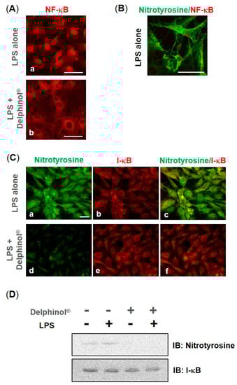 Effects of Delphinol® on the transnucleation of NF-κB and tyrosine nitration of I-κB. (A–C) Immunofluorescent staining of MC3T3-E1 cells for NF-κB/p65, nitrotyrosine, and I-κB. Cells were grown for 3 days in the absence or presence of 25.0 μg/mL Delphinol®, then incubated with 10 μg/mL LPS for 3 h. Scale bars = 50 μm. (D) Cell samples were immunoprecipitated with anti-I-κB antibody, and then blotted with either anti-nitrotyrosine antibody or anti-I-κB antibody.