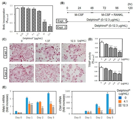 Next, we investigated the effects of MBE on osteoclastogenesis by using primary mouse bone marrow cells. Our preliminary experiment, in which MBE (0–111 μg/mL) was added only during the first two days of culture before being changed to fresh media containing Leukoprol and RANKL, showed that a higher dose of MBE had cytotoxic effects on OC precursors (data not shown). To determine the MBE concentration that was expected to impair the precursor proliferation, the effects of MBE on BrdU incorporation activity were examined (Figure 3A). As shown in Figure 3A, MBE higher than 37.0 μg/mL exhibited a cytotoxic effect on bone marrow-derived monocyte/macrophage precursor cells (BMM). Therefore, we used MBE lower than 12.3 μg/mL in the osteoclastogenesis assay. MBE was present throughout the 120-h culture period in Experiment 1, whereas MBE was present only during the differentiation of BMM into mature multinucleated OC by RANKL in Experiment 2 (Figure 3B). Dose-dependent inhibitory effects of MBE at concentrations higher than 1.37 μg/mL were observed in both experimental protocols, which indicated that MBE dose-dependently inhibited the maturation of OC (Figure 3C,D). qPCR analysis of OC showed that MBE inhibited the RANKL-induced upregulation of mRNA of Nfatc1, which is a master transcriptional factor for osteoclastogenesis [], and CtsK, which is a cysteine protease predominantly expressed in OC, at concentrations higher than 4.1 µg/mL dose-dependently (Figure 3E).