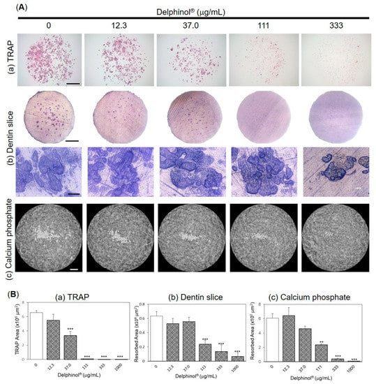 Effects of Delphinol® on pit formation by mature OC. (A) Representative photographs of (a) TRAP staining, (b) resorption pit on dentine slices, and (c) resorption of calcium phosphate in OC cultures. (B) Anti-resorption activity of MBE was evaluated by measuring the area per well. Values are expressed as mean ± SD (n = 3–4). **p < 0.01, ***p < 0.001. Scale bars are 2 mm except for the lower panel of Figure 4(Ab) (20 μm).