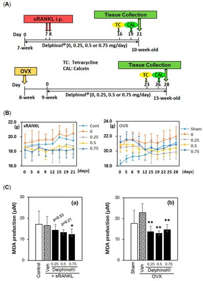 In vivo experimental protocol and effects of Delphinol® on body weight and plasma malondialdehyde (MDA) level. (A) Experimental protocol of sRANKL-induced (upper panel) and ovariectomized (OVX) (lower panel)-induced osteopenic mouse models. All mice were injected with two fluorescent molecules, tetracycline and calcein, sequentially prior to sacrifice for the purpose of kinetic analyses in bone histomorphometry. (B) Changes in body weight during the experiment. (C) Plasma MDA levels in sRANKL-induced (a) and OVX (b)-induced osteopenic mice. Values are expressed as mean ± SD (n = 5–8). p values and significance levels are the comparisons between vehicle-treated and MBE-treated groups. *p < 0.05, **p < 0.01.