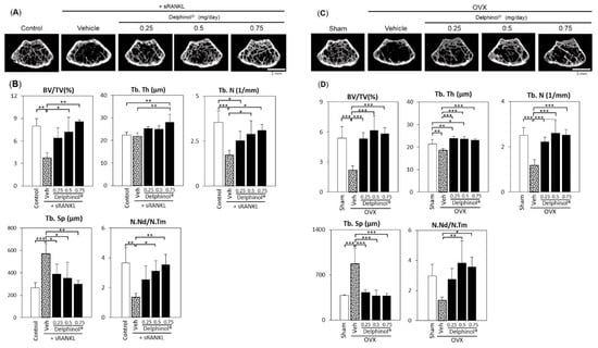 2.6. In Vivo Examination in sRANKL and Ovariectomy-Induced Osteopenic Mouse Models