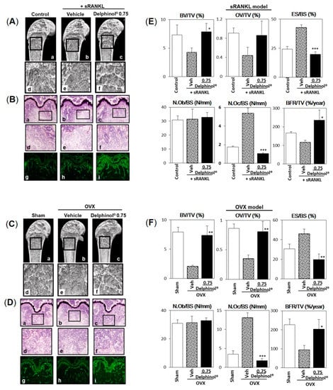 Histomorphometrical analyses of effect of Delphinol® on bone loss in sRANKL-induced and OVX-induced osteopenic mouse models. (A) Representative three-dimensional micro-CT images of the sagittal midsection of distal end of femurs in intact mice (Figure 7(Aa,Ad), control), sRANKL-induced osteopenic mice (Figure 7(Ab,Ae), vehicle), and Delphinol® 0.75 (mg/mouse/day)-administered sRANKL-induced osteopenic mice (Figure 7(Ac,7Af)). (C) Representative micro-CT images of the sagittal midsection of distal femurs in sham-operated mouse (Sham), OVX-induced osteopenic mouse (vehicle), and a Delphinol® 0.75 (mg/mouse/day)-treated OVX-induced osteopenic mouse. (B,D) Representative photographs of distal femur sections stained by Villanueva staining in sRANKL- and OVX-induced osteopenic mice, respectively. Figures in the middle panel correspond to the squares in the upper panel. Figures in the lowest panel are fluorescent (calcein) images of the same field of Villanueva staining. (E,F) Histomorphometric parameters were determined by morphometric analyses of fluorescent (tetracycline and calcein)-labeled femurs according to the methods of the ASBMR Histomorphometry Nomenclature Committee []. Values are expressed as mean ± SD (n = 5).; Significance was tested between vehicle and 0.75 mg/mouse/day Delphinol®. *p < 0.05, **p < 0.01, ***p < 0.001.