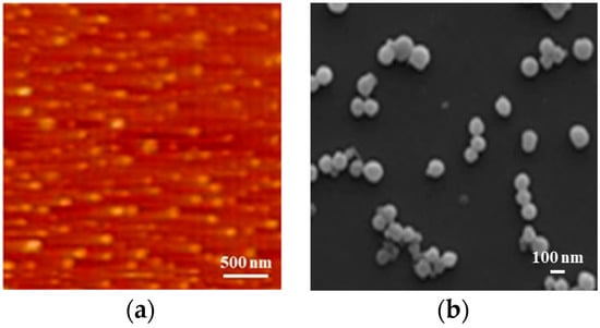 OPO/zein in the preparation of nanocapsules was at the mass ratios of 1/10, 2/10, 3/10, 4/10, and 5/10 respectively, and the encapsulation results are shown in Figure 2. It can seen from the figure that the encapsulation effect was different, probably because of the different mass ratios of OPO and zein, the thickness of the nanocapsule core–shell formed during the precipitation process was different. The best encapsulation effect occurred at a ratio of 3/10, with encapsulation rate reaching at 71.74% ± 1.13%. At the ratios of 4/10 and 5/10, the encapsulation effect was also not bad. The encapsulation effect increased first and then decreased as the proportion increased, suggesting that the mass ratio of OPO and zein could increase the encapsulation effect of nanocapsules within a certain range. When the content of OPO was too much, the encapsulation efficiency decreased, indicating that zein was insufficient to encapsulate all OPO, thus resulting in an aggregation of OPO droplets and formation of solid zein spheres. When there is too much zein, it could be inferred that zein was sufficient to form a complete shell around the OPO droplets, which in turn grew thicker due to further deposition of zein from the bulk. The excess zein would be self-assembled and precipitated in the form of solid particles due to the decrease of zein solubility with water addition, confirmed by Filippidi et al. [] who reported that addition of water to the initial zein solution resulted in homogeneous precipitation and the formation of solid particles of pure zein. Therefore, the OPO/zein ratio of 3/10 showed the best encapsulation effect. The spherical appearance and nanostructure of the freeze-dried OPO–zein-3/10 nanocapsules were observed by AFM (Figure 3a) and SEM (Figure 3b). It was revealed that most of OPO–zein-3/10 nanocapsules had a particle size of 102.7 ± 10.5 nm. There were also very few relatively small particles, possibly self-assembling particles formed by zein. Also, the composite nanocapsules had a uniform particle size [], no agglomeration, and exhibited good dispersibility, which indicated that this system was capable of producing nanocapsules with almost the same mean particle size and resolved the common problems of previous studies, such as flocculation.