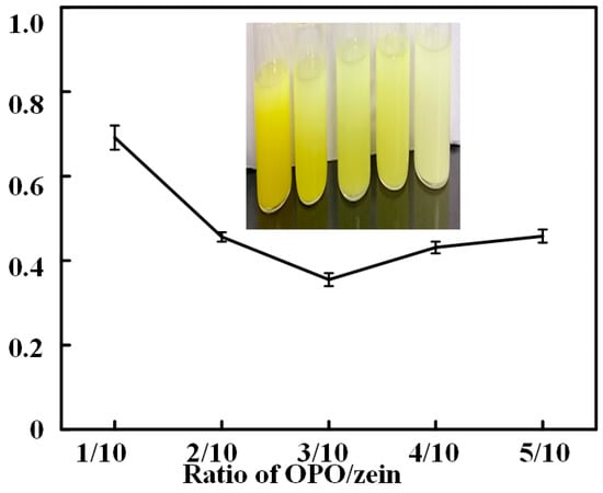 The turbidity of an emulsion is a function of droplet size and concentration. Therefore, the change in turbidity indicates the change in droplet size and concentration with time. Figure 4 shows the turbidity of different ratios of OZN after 24 h. It could be seen from the figure that as the ratios increased, the turbidity of the emulsion of OZN first decreased and then increased, which mainly changed in the range of 0.37 ± 0.11 to 0.72 ± 0.15. When the ratio was 3/10, the turbidity was the lowest at 0.37 ± 0.11. When the ratio was further increased, although the turbidity increased, the increase was not obvious, indicating that the balance of Van der Waals, electrostatic, and polymeric steric interactions were the main droplet interactions playing a role in determining the stability of emulsion systems. The magnitude of repulsive interactions and forces between emulsion droplets plays a positive role in nanoemulsion stability. However, flocculation, coalescence, and aggregation may be responsible for the increased turbidity when the ratio was further increased [].