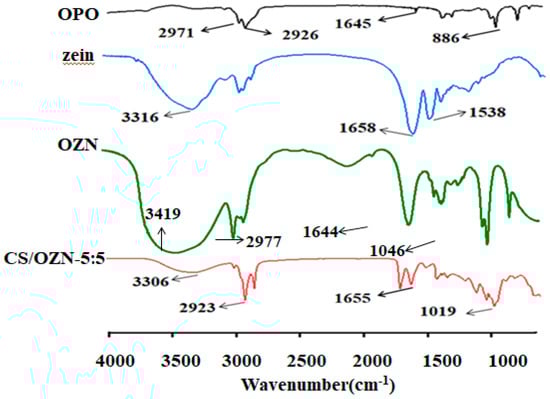 Infrared spectra of OPO, zein, OZN, CS/OZN composite films were obtained, as shown in Figure 6. The spectrum of OPO showed a characteristic peak at 886 cm−1 due to C–H bending, 1645 cm−1 due to C=C stretching, and 2826 and 2971 cm−1 due to C–H stretching []. The band in 3100–3500 cm−1 was due to the O–H stretching vibration of the hydroxyl group. In the spectra of zein and CS/OZN composite films, the characteristic peaks of the hydroxyl group were at 3306 and 3316 cm−1, respectively, which was similar to the result of Li et al. []. The first characteristic peaks of zein were 1658 cm−1 (amide I, C=O stretching) and 1538 cm−1 (amide II, N−H bending). Besides, in the spectra of OZN, both the characteristic peaks of OPO and zein appeared. The characteristic peak of the C–O–C bond is 1014 cm−1, and the absorption peak is blue-shifted to 1019 cm−1. This suggests that the addition of OZN may hinder the formation of hydrogen bonds in the matrix. Also, comparing to OPO, a new peak was found in the spectrum of CS/OZN composite films at 1655 cm−1, corresponding to the characteristic peak of zein. Similar results were also observed in the spectrum of zein/rhamnolipid composite nanoparticles [].
