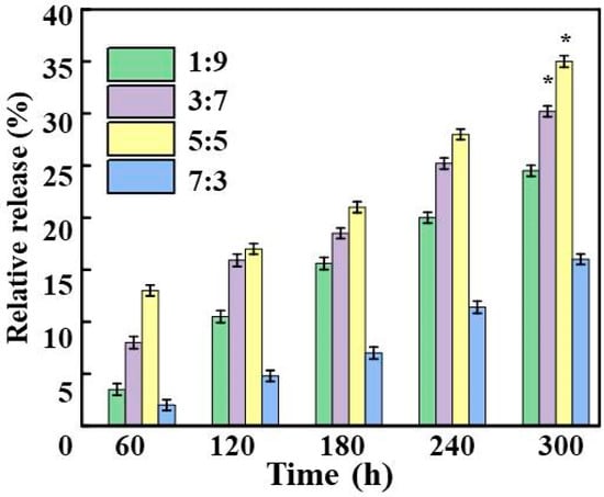 In this study, the amount of OPO released relative to the composite film within 300 h was recorded. The results in Figure 7 show that the relative release concentration of OPO was the highest at a ratio of 5/5, and over time it would last longer to maintain a higher release concentration without sudden release after 120 h. This phenomenon was the same as the explosive release of essential oils which was recorded by some scholars []. This indicated that the composite film formed by nanoencapsulation of OPO in the food industry had controllability for the release of OPO, and the surfactants Span 80 may increase the fluidity between the components and regulate the permeation rate of OPO []. When the content of OZN was excessive over 5:5, the relative release concentration was lowered. The reason may be that excessive nanocapsules may agglomerate during film preparation, making it impossible to mix the nanocapsules with CS completely []. Some nanocapsules aggregated and the formed agglomerated nanocapsules were on the surface of the composite film (Figure 5), thereby volatilizing due to being at a surface and having a high temperature during baking, so that the final obtained composite film itself had a low content of OPO, and therefore, the relative release concentration was also low [].