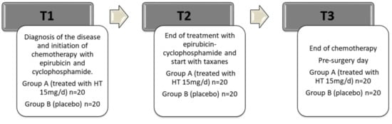 The design of this study was a triple-blind randomized trial with parallel groups (supplemented with HT or placebo). The study population consisted of those patients selected by the Breast Committee for neoadjuvant therapy according to the criteria included in the Clinical Practice Guideline prepared by the Subcommittee at Jaen Hospital. All the patients signed an informed consent for their inclusion in the study prior to their participation. The study was conducted in accordance with the Declaration of Helsinki, and the protocol was approved by the Ethics committee of Jaen Hospital, Spain (code: PI-0695-2012).