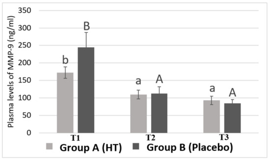 Plasma levels of MMP-9 in women with breast cancer. Values are shown as the mean ± standard error of the mean. Bars not sharing superscript letters are statistically different at p < 0.05 for each experimental group (lowercase for Group A treated with hydroxytyrosol and uppercase for Group B treated with placebo) at each time point (TI, T2 and T3).
