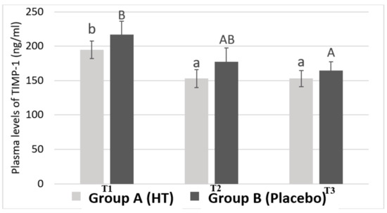 Plasma levels of the tissue inhibitor of metalloproteinases I (TIMP-1) in women with breast cancer. Values are shown as the mean ± standard error of the mean. Bars not sharing superscript letters are statistically different at p < 0.05 for each experimental group (lowercase for Group A treated with hydroxytyrosol and uppercase for Group B treated with placebo) at each time point (TI, T2 and T3).