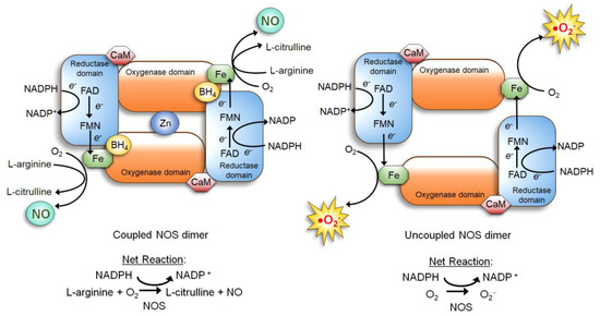 Nitric Oxide Synthase (NOS) dimer in the coupled (normal) vs. uncoupled states [40]. (Left) In the normal coupled state, two NOS monomers are tethered by BH4, which also increases the binding affinity of the substrate L-arginine. Furthermore, the NOS dimer is stabilized by a zinc ion coordinated in the oxygenase domains of two monomers. Dimerization allows the coupling of two reactions: 1) electron flow: nicotinamide adenine dinucleotide phosphate (NADPH)→ flavin adenine dinucleotide (FAD)→ flavin mononucleotide (FMN)→ Fe of the heme→ molecular oxygen; and 2) oxidation of L-arginine. This coupling yields NO and L-citrulline. (Right) When the BH4 level is scarce, NOS remains as a monomer and fails to bind L-arginine. The electron flow to molecular oxygen (Reaction 1) is uncoupled to L-arginine oxidation (Reaction 2), yielding superoxide (O2•−).