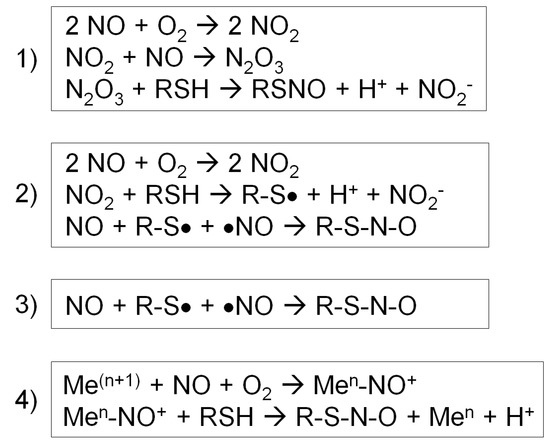 Case (2) First, NO reacts with O2 to form NO2, and NO2 reacts with a thiol to produce a thiol radical and nitrite. Then, NO reacts with a thiol radical to form a nitrosothiol (Figure 2, reaction 2) [56].