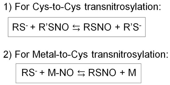 Two types of transnitrosylation reactions. (1) Cys-to-Cys transnitrosylation. (2) Metal-to-Cys transnitrosylation.