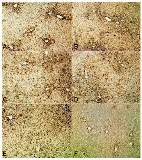 An immunohistochemical analysis indicated the presence of the MT1 protein but not of the MT2 protein, in the rat liver. In sham-operated animals, MT1 was found in a dense configuration around the central veins of hepatic lobules, while hardly any MT1 was identified in the periportal regions of hepatic lobules (Figure 5A). This configuration was altered after treatment with melatonin (Figure 5B) or ramelteon (Figure 5C), as well as in all groups undergoing hemorrhagic shock (Figure 5D–F), resulting in a somewhat disseminated pattern of MT1 in the centrilobular area in all groups. After hemorrhagic shock and treatment with melatonin (Figure 5E) or ramelteon (Figure 5F), the presence of MT1 was diminished.