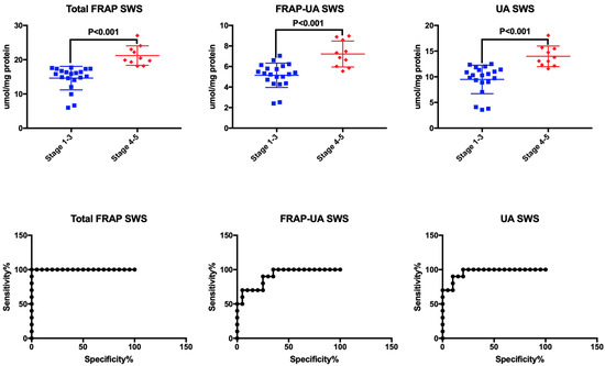 Receiver operating characteristic (ROC) analysis of total antioxidant capacity measured by FRAP in stimulated saliva of children at stage 1–3 and stage 4–5 of chronic kidney disease (CKD). FRAP—ferric ion reducing antioxidant parameter; FRAP-UA—UA-independent FRAP; SWS—stimulated whole saliva; UA—uric acid.