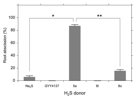It is important to note that the H2S donor 5a (Equation (1)) as well as 8l and 8o (Equation (2)) decomposes with multiple steps. For each reaction, the presence of thiol (–SH) is required [37]. The difference in structure between 8l and 8o is the R moiety (8l: R = –CH3, 8o: R = –C(CH3)3). If the compound 5a, in fact, induced root abscission by its chemical reaction, the question arose as to whether the effect relied on H2S or on interactions with thiols within the cells. The minimal effect of the spontaneous H2S donor Na2S and GYY4137 on root abscission led us to check the actions of polysulfides.