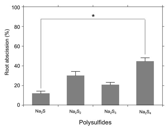 Figure 5 shows effects of sodium polysulfides (Na2Sn) on the root abscission. We compared sodium sulfide (Na2S), sodium disulfide (Na2S2), sodium trisulfide (Na2S3), and sodium tetrasulfide (Na2S4). All of these tested compounds showed some abscission-inducing effects, with the polysulfide Na2S4 being much more effective than Na2S in detaching the roots (Figure 5).