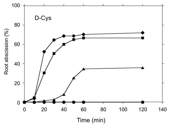 Time course of the d-cysteine-induced root abscission in A. pinnata. 3 mM of either d-cysteine (d-Cys) or l-cysteine (l-Cys) was added into the culture medium (pH 5.8). Means ± SE (n = 5).