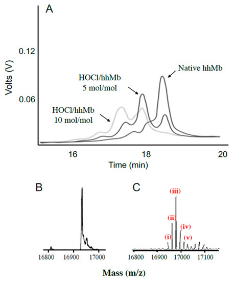 Subsequently, samples of native or HOCl-modified Mb (10 mol HOCl/mol protein) were assessed with mass spectrometry (Figure 4B,C). In the absence of HOCl the vehicle treated hhMb showed a single mass peak with mass 16,951.2 m/z in the deconvoluted spectrum, which closely matches the previously reported value for native hhMb (16,951.5 m/z) [28]. Clearly, treatment of hhMb with reagent HOCl yielded a complex mixture of products with the corresponding deconvoluted mass spectrum showing multiple mass peaks, with the major peak responses differing by multiples of ~16 (compare the multiple peaks marked (i–v), Figure 4C with native hhMb sample exposed to PBS as a vehicle control, Figure 4B as listed in the legend to the figure). These mass changes were consistent with successive covalent addition of molecular oxygen to the protein that was previously ascribed to methionine (Met) residue sulfoxidation at Met55 and Met131 and tryptophan (Trp) residue oxidation at Trp 7 and Trp 14 in the hhMb sequence as defined previously in hhMb using LC/MS tandem MS/MS [21]; the extent of amino acid oxidation followed the reactivity order Met55 > Met131 > Trp7 > Trp14 [21]. While addition of molecular oxygen to methionine simply yields the corresponding sulfoxide, oxidation of Trp is more complex with 3-hydroytryptophan forming an equilibrium with the corresponding 3-keto analogue that can subsequently yield kynurenine in the presence of excess oxidant through the intermediate N-formyl kynurenine [29].