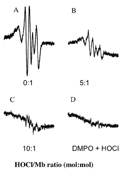 Treatment of hhMb with regent HOCl inhibits the formation of protein-centered radicals as detected by spin trapping. Solutions of hhMb (final concentration 500 µM) were exposed to an increasing dose of reagent HOCl (final oxidant:protein mol ratio indicated in the representative spectra shown in panels (A) Control; (B) hhMb pretreated with HOCl 5 mol/mol protein; (C) hhMb pretreated with HOCl 10 mol/mol protein and (D) absence of hhMb). All hhMb solutions contained 100 µM the chelator diethylenetriaminepentaacetic acid (DTPA). Aliquots of reaction mixture were then treated with hydrogen peroxide (final ratio H2O2:hhMb ∼5 mol/mol) or phosphate buffer (as a vehicle control) in the presence of 5 mM 5,5-dimethyl-1-pyrroline N-oxide (DMPO) as described in the Methods section. The reaction mixture was then rapidly transferred to a flat cell and radical generation assessed using EPR spectroscopy with the following parameters: Microwave power 20 mW, modulation amplitude 0.1 mT, modulation frequency of 100 kHz and a sweep time of 84 s. EPR spectra were obtained as a cumulative average of five consecutive scans. No signal was obtained in the absence of DMPO or H2O2 (data not shown). Data are representative of n = 3 independent experiments using freshly prepared protein radicals.