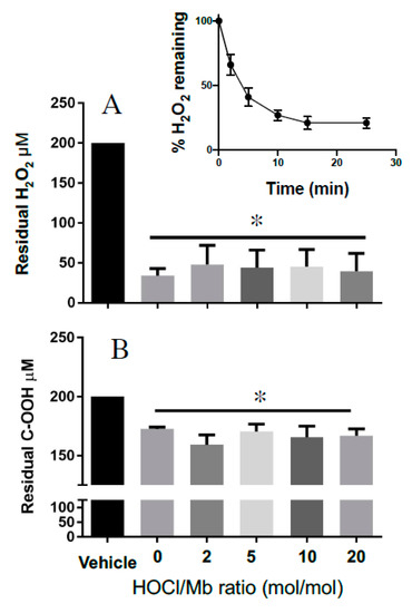 Next, we evaluated the impact of reagent HOCl on Mb catalase-like activity. This catalytic activity also involves conversion of MbFe(III) to MbFe(IV)=O+•. However, in the absence of a suitable substrate MbFe(IV)=O+• can act as a two-electron oxidant toward excess peroxide, generating water, oxygen and subsequently recycling MbFe(III) in this reaction. Initially, we tested the time-dependent consumption of H2O2 in the presence of hhMb to ascertain an appropriate time to assess residual peroxide levels after the reaction had reached near completion (i.e., achieved a steady state). Addition of hhMb to a fixed concentration of H2O2 (200 µM) resulted in a rapid depletion of the peroxide in the first 2–5 min of the reaction; the reaction rate decreased over the ensuing 20 min and achieved a steady-state at ~15 min (Figure 7A, inset); this time was judged as suitable to determine whether HOCl-oxidation of hhMb affected the protein’s catalase-like activity. In contrast with the measurement of peroxidase activity that was sensitive to reagent HOCl, steady state determinations of hhMb catalase-like activity remained unaffected by HOCl as judged by the similar extent of H2O2 degradation (consistently ~80–85% of the initial H2O2 concentration was consumed) in the presence of native or HOCl-oxidized hhMb under the same experimental conditions (Figure 7A). That is, while the depletion of H2O2 was significantly different for all the hhMb proteins compared with vehicle alone (addition of vehicle containing no protein) there was no difference in the extent of H2O2 depletion amongst the native or HOCl-oxidized proteins tested. This ability for hhMb to act as a catalase antioxidant mimetic was relatively selective for H2O2 since degradation of an organic peroxide (cumene hydroperoxide; C–OOH) was markedly less efficient than the degradation of H2O2 under the identical reaction conditions (comparatively only ~12–18% of the initial C–OOH concentration is consumed; c.f., Figure 7A,B). Interestingly, this diminished capacity to degrade the organic peroxide-OOH also remained independent of the extent of HOCl oxidation as the extent of C–OOH degradation remained largely the same for both native and all HOCl-modified hhMb tested. That is, similar to the case with H2O2, the depletion of C–OOH was significantly different for all the hhMb proteins compared with vehicle alone (compared with vehicle-treated peroxide containing no protein) yet there was no difference in the extent of cumene hydroperoxide depletion when comparing the native and HOCl-oxidized proteins tested.
