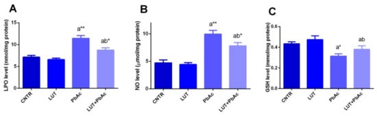 The indicators of liver integrity, including aspartate aminotransferase (AST) and alanine aminotransferase (ALT), and total bilirubin levels were measured in the liver samples. The injection of rats with PbAc lead to a significant rise (p < 0.05) in AST, ALT, and total bilirubin levels, compared to those of the control group, whereas prior treatment with LUT markedly lowered (p < 0.05) the levels of these physiological indices relative to those of the PbAc-treated group (Figure 2).
