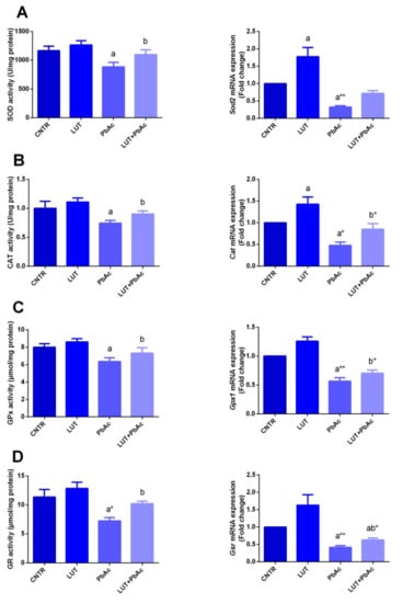 In our study, 1 week after PbAc and/or LUT treatments, the protein levels and mRNA expression of the antioxidant molecules (SOD, CAT, GPx, and GR) and oxidants, including MDA and NO along with GSH, were investigated in the liver tissues. Significant decreases in the levels of SOD, CAT, GPx, and GR were recorded (p < 0.05), associated with downregulation of their gene expression, i.e., Sod2, Cat, Gpx, and Gsr in PbAc-treated rats, compared to the control values. These alterations were remarkably protected when LUT was administrated before PbAc, as LUT significantly boosted (p < 0.05) the antioxidant status of hepatic tissue and significantly increased (p < 0.05) GSH concentration. Treatment with PbAc produced a dramatic elevation in MDA and NO levels, along with a significant decrease in GSH, compared with those of the control group. These effects were markedly reversed (p < 0.05) when LUT was administered before the PbAc injection (Figure 3 and Figure 4).