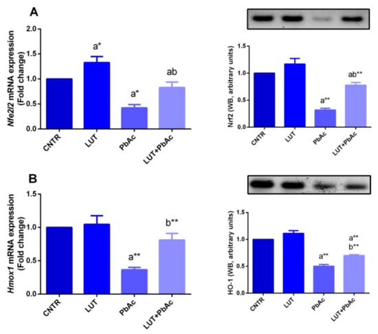 Hepatic protein and mRNA gene expression levels of Nrf2 (A) and HO-1 (B) following lead acetate (PbAc, 20 mg/kg, i.p.) and/or luteolin (LUT, 50 mg/kg, orally) exposure in male rats. Results of mRNA are recorded as the mean ± SD of five assays in duplicate and Gapdh was the housekeeping gene, whereas β-actin was used as the reference control for western blot analysis. a represents the statistical significance relative to that of the control group at p < 0.05. b represents the statistical significance relative to that of the PbAc-injected group at p < 0.05. * reflects the statistical significant differences between groups at p-values < 0.01. Moreover, ** reflects the statistical significant differences between groups at p-values < 0.001.