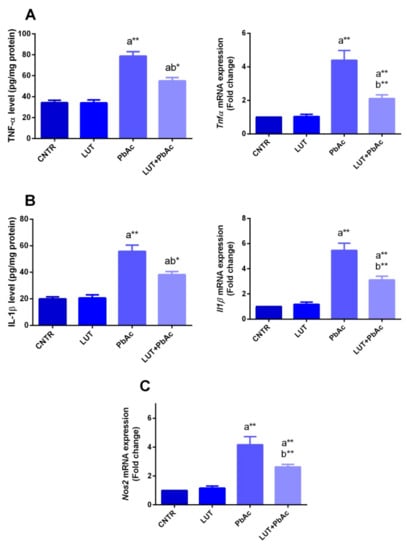 Hepatic levels of TNF-α (A) and IL-1β (B) and Nos2 (C) mRNA expression following lead acetate (PbAc, 20 mg/kg, i.p.) and/or luteolin (LUT, 50 mg/kg, orally) exposure in male rats. The biochemical data are expressed as the mean ± SD (n = 7). mRNA expression results are recorded as the mean ± SD of five assays in duplicate referenced to Gapdh and represented as fold changes (log2 scale) as compared with the mRNA levels of the control group. a represents the statistical significance relative to that of the control group at p < 0.05. b represents the statistical significance relative to that of the PbAc-injected group at p < 0.05. * reflects the statistical significant differences between groups at p-values < 0.01. Moreover, ** reflects the statistical significant differences between groups at p-values < 0.001.