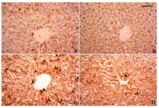 For immunohistochemistry examination of nuclear factor kappa B (NF-κB) in the hepatic tissue, a standard protocol with monoclonal anti-NF-κB antibody (Santa Cruz, CA, USA) was employed. Hepatic sections were examined using a 400× magnification lens (Nikon Eclipse E200-LED, Tokyo, Japan).