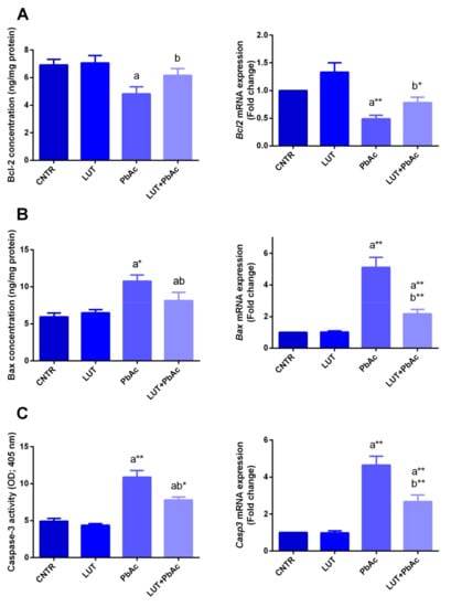 The PbAc treatment significantly enhanced the protein levels and expression of pro-apoptotic parameters; caspase-3 (p < 0.05) and Bax (p < 0.05) were enhanced in the liver tissue, in comparison with the control. In contrast, the level and mRNA expression of Bcl-2, an anti-apoptotic marker, exhibited a significant decline (p < 0.05) following PbAc exposure. Pre-administration of LUT significantly suppressed the loss of hepatocytes by downregulating the pro-apoptotic proteins and enhancing the upregulation of the anti-apoptotic proteins, compared to that with PbAc-treatment alone (Figure 8).